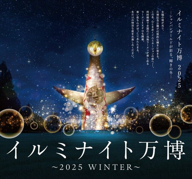 大阪・吹田市の万博記念公園を舞台に、太陽の塔が光り輝く幻想的なイルミネーションイベント「イルミナイト万博2025WINTER」が今年も開催されます。冬の夜空を背景に、太陽の塔が華やかにライトアップされ、まるで光の芸術作品のような姿に。園内は幻想的な光に包まれ、写真映えも抜群。ラーメンEXPOも同時開催され、あたたかいグルメと共に心まで温まるひとときを過ごせます。